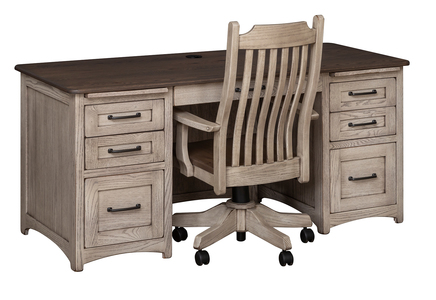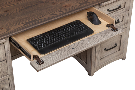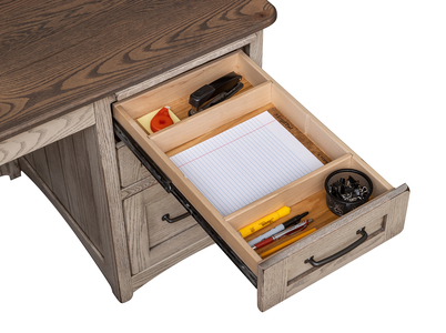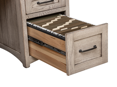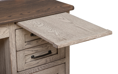 With its distinctive flat, grooved side panels, this large Farmstead desk will make a bold impression. Built to last for generations, the desk comes standard with keyboard drawer, two writing pull-outs, four storage drawers, and two file drawers that hold either legal or letter-sized files.